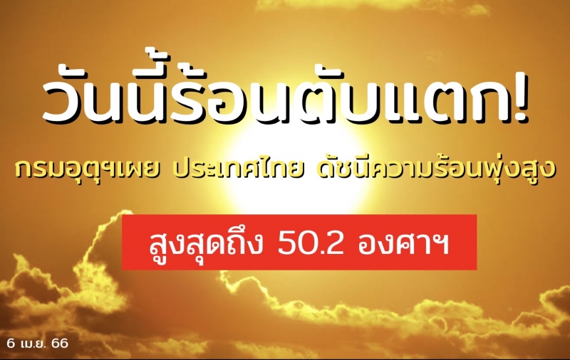 | • 6 เม.ย. 66 ร้อนตับแตก! กรมอุตุฯเผย ประเทศไทย ดัชนีความร้อนพุ่งสูง สูงสุดถึง 50.2 องศาฯ |