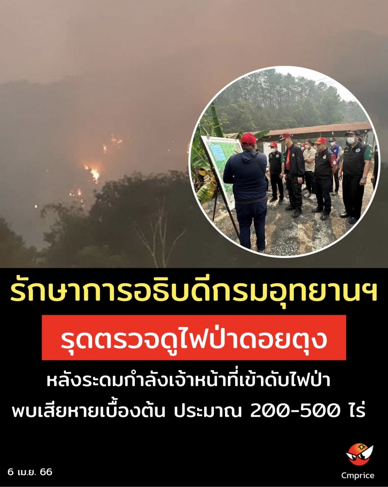วันที่ 6 เมษายน 2566 นายอรรถพล เจริญชันษา อธิบดีกรมทรัพยากรทางทะเลและชายฝั่ง รักษาราชการแทนอธิบดีกรมอุทยานแห่งชาติ สัตว์ป่า และพันธุ์พืช ได้เดินทางไปตรวจสถานการณ์ไฟป่าที่เกิดขึ้นในพื้นที่ดอยตุง หมู่บ้านผาบือ-บ้านลาบา ต.แม่ฟ้าหลวง อ.แม่ฟ้าหลวง จ.เชียงราย