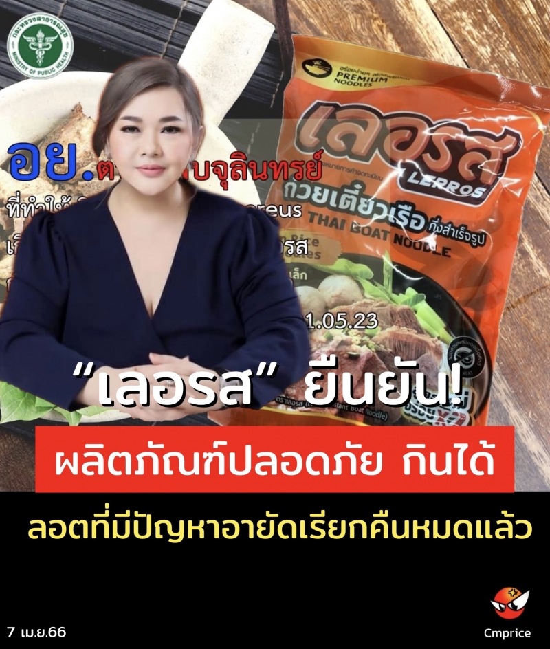 วานนี้ 6 เมษายน 2566 คุณพรภิชญา โพธิ์ทอง เจ้าของก๋วยเตี๋ยวเรือกึ่งสำเร็จรูปเลอรส ชี้แจงกรณีอย.ตรวจพบจุลินทรีย์ที่ทำให้เกิดโรค Bacillus cereus (ทำให้เกิดโรคอาหารเป็นพิษ)
