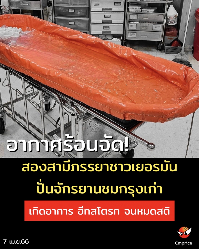 | • อากาศร้อนจัด! สองสามีภรรยาชาวเยอรมัน ปั่นจักรยานชมกรุงเก่าแล้วเกิดอาการ ฮีทสโตรก จนหมดสติ |