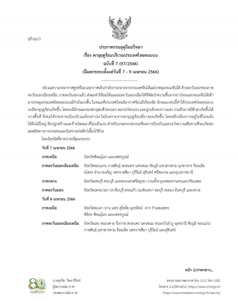 กรมอุตุนิยมวิทยาจะออกประกาศฉบับต่อไปใน วันที่ 8 เมษายน พ.ศ. 2566 เวลา 05.00 น.