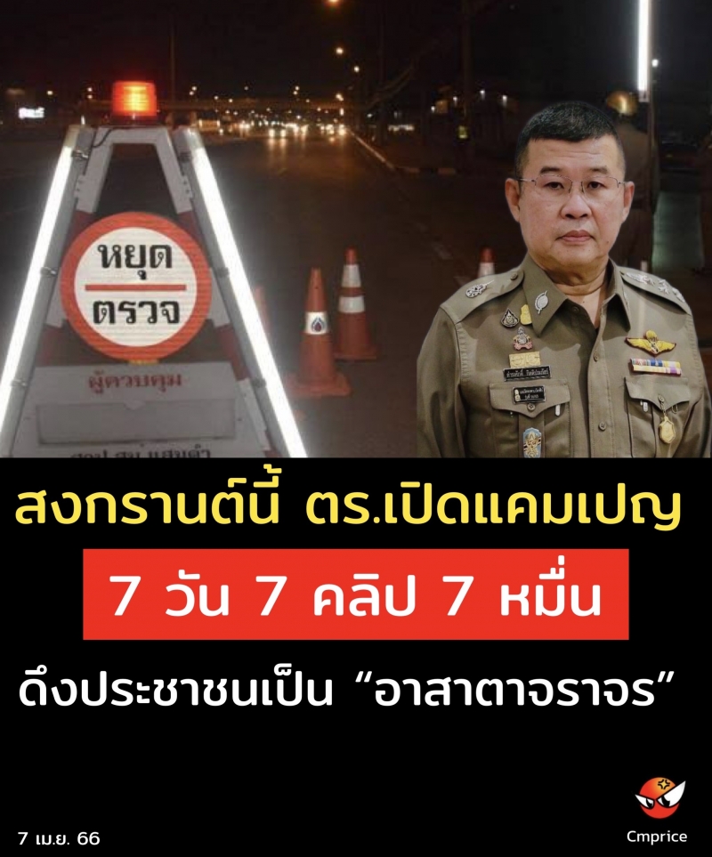 2) ในช่วงเทศกาลสงกรานต์นี้ จะมีแคมเปญพิเศษเพิ่มเติม ในชื่อว่า “7 วัน 7 คลิป 7 หมื่น” สำหรับให้ประชาชน ส่งคลิปอุบัติเหตุช่วง 7 วันควบคุมเข้มข้นของเทศกาลสงกรานต์ ระหว่างวันที่ 11 ถึง 17 เมษายน 2566 มาร่วมในโครงการ และจะทำการคัดเลือกคลิปสำคัญที่เป็นพยานหลักฐานทางคดี จำนวน 7 คลิป รางวัลคลิปละ 10,000 บาทรวม 70,000 บาท