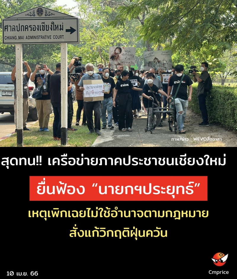 10 เมษายน 2566 เครือข่ายภาคประชาชนเชียงใหม่ยื่นศาลปกครองเชียงใหม่ ฟ้อง “พลเอกประยุทธ์” นายกรัฐมนตรีและหน่วยงานเกี่ยวข้อง เหตุเพิกเฉยใช้อำนาจหน้าที่ตามกฎหมายแก้ไขปัญหาและบรรเทาสถานการณ์ความรุนแรงของวิกฤตฝุ่นควัน ทอดทิ้งประชาชนเผชิญภยันตรายต่อชีวิตและสุขภาพอนามัยต่อเนื่องยาวนานเป็นเดือน รอลุ้นรับเป็นคดีฉุกเฉิน