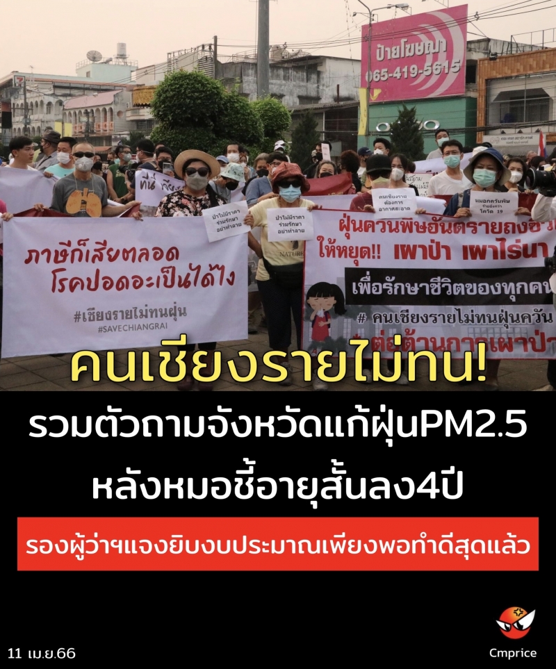 เย็นวานนี้(10 เม.ย.) ที่ลานหน้าอนุสาวรีย์พ่อขุนเม็งรายมหาราช ห้าแยกพ่อขุน อ.เมืองเชียงราย จ.เชียงราย กลุ่มเยาวชนซึ่งใช้ชื่อว่า "ประชาชนชาวเชียงราย" ประมาณ 200 คน ประกอบด้วยคณะสงฆ์และสามเณรจากวัดพุทธอุทยานดอยอินทรีย์ กลุ่มแพทย์ใน จ.เชียงราย ภาคเอกชน เยาวชน องค์กรเอกชน ฯลฯ ได้ไปรวมตัวจัดกิจกรรมรณรงค์แก้ไขปัญหาฝุ่น PM 2.5 และขอยื่นหนังสือต่อนายพุฒิพงศ์ ศิริมาตย์ ผู้ว่าราชการ จ.เชียงราย ขอทราบการแก้ไขปัญหาของจังหวัดทั้งในระยะสั้น ระยะกลาง ระยะยาว โดยมีการถือป้ายข้อความต่างๆ บางป้ายเขียนล้อคำขวัญประจำจังหวัด รวมทั้งเปิดให้ผู้คนเขียนข้อความแสดงความเห็นบนกระดาน ก่อนผลัดกันปราศรัยยังได้มอบน้ำดื่มเกลือแร่ ฯลฯ ที่มีผู้นำไปบริจาคให้กับเจ้าหน้าที่ดับไฟป่าเพื่อนำไปใช้ในภารกิจอีกด้วย
