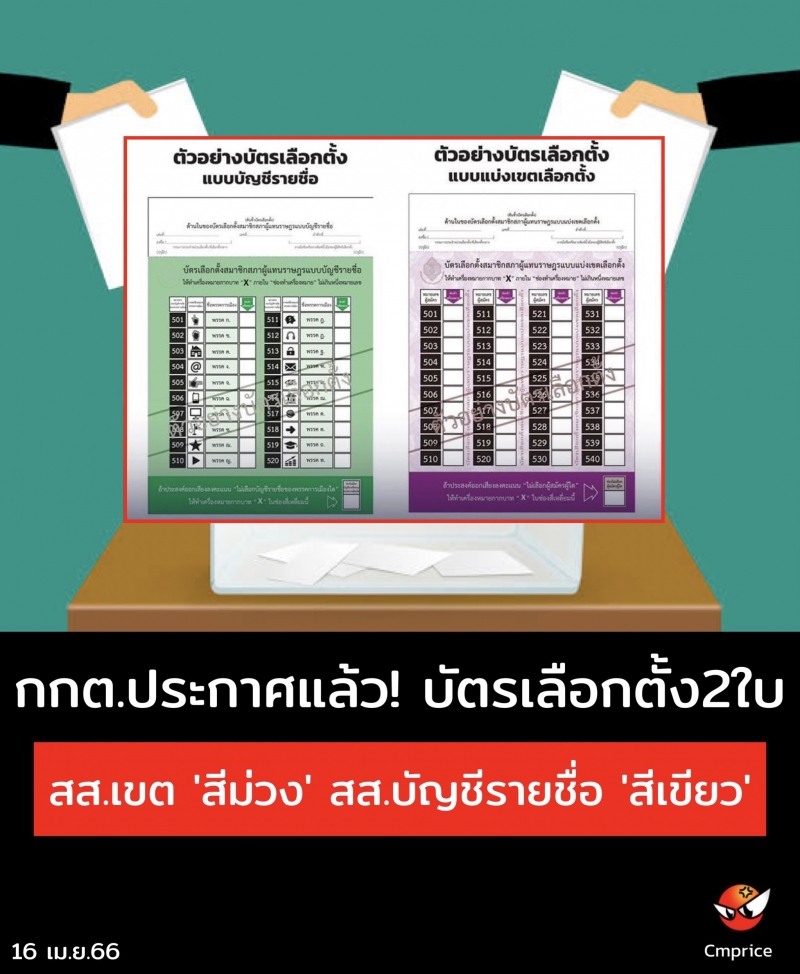 กกต.ประกาศแล้ว! สีบัตรเลือกตั้ง ส.ส. มี 2 สี บัตรเลือกตั้งแบบแบ่งเขตเป็นสีม่วง และบัตรเลือกตั้งแบบบัญชีรายชื่อเป็นสีเขียว