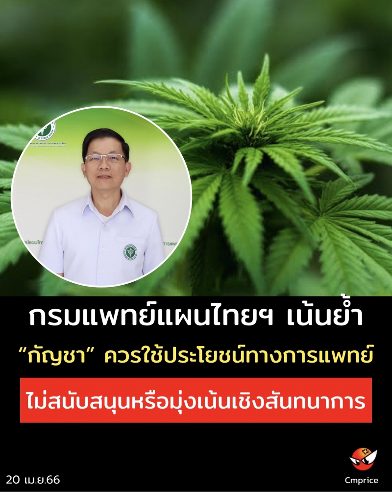 นายแพทย์ธงชัย เลิศวิไลรัตนพงศ์ อธิบดีกรมการแพทย์แผนไทยและการแพทย์ทางเลือก กล่าวว่า เนื่องในวันกัญชาโลก ที่จะถึงในวันที่ 20 เมษายน ทางกระทรวงสาธารณสุข โดยกรมการแพทย์แผนไทยและการแพทย์ทางเลือก เรายังขับเคลื่อนกัญชาทางการแพทย์อย่างต่อเนื่อง เพื่อมุ่งเน้นให้ประชาชนใช้กัญชาเพื่อประโยชน์ทางการรักษา เพื่อเป็นทางเลือกหนึ่งในการดูแลผู้ป่วยที่มีพื้นฐานจากภูมิปัญญาไทย โดยเน้นการบูรณาการการรักษาผู้ป่วยและประชาชนอย่างมีประสิทธิภาพร่วมกับสหวิชาชีพ เพื่อให้ครอบคลุมในทุกมิติของการให้บริการ และตอบสนองต่อความต้องการของผู้ป่วยอย่างแท้จริง การรักษาด้วยกัญชาทางการแพทย์แผนไทย ตั้งแต่ปี 2562 – ปัจจุบัน มีผู้ป่วยเข้ารับการรักษาด้วยตำรับยากัญชาทางการแพทย์รวมกว่า 79,423 ราย รักษาในกลุ่มอาการนอนไม่หลับ จำนวน 197,516 ครั้งอาการปวดตามร่างกาย (ปวดขา ปวดเข่า ปวดบ่า ปวดไหล่) 18,179 ครั้ง อาการปวดหลัง 9,558 ครั้ง อาการลมปะกังหรือ ลมตะกัง 8,659 ครั้ง อีกทั้ง อาการอื่นๆ อาทิ อาการสันนิบาตลูกนก (โรคพาร์กินสัน) ลมจับโปงแห้งเข่า ปวดศีรษะ อาการชา รวม 14,131 ครั้ง นอกจากนี้ยังมีการจัดทำแนวทางการนำกัญชาทางการแพทย์แผนไทยและการแพทย์ทางเลือกมาบูรณาการในระบบบริการสุขภาพ มี 4 แนวทาง คือ 1) แนวทางการดูแลผู้ป่วยกลุ่มโรคมะเร็งและผู้ป่วยระยะประคับประคอง (Palliative care) 2) แนวทางการดูแลกลุ่มผู้ป่วยระยะกลาง (Intermediate care) 3) การดูแลผู้ป่วยโรคพาร์กินสันด้วยกัญชาทางการแพทย์แผนไทย 4) การดูแลผู้ป่วยด้วยการแพทย์แผนไทยในหน่วยบริการปฐมภูมิ (Primary Care Cluster) ทั้งนี้ที่ผ่านมา กัญชา มีการใช้ในชุมชน พื้นบ้านในทุกภาคของประเทศ จากการถอดองค์ความรู้การใช้กัญชาของชาวบ้านทั้ง 4 ภูมิภาค พบว่า มีการใช้ในวิถีชีวิต เป็นอาหาร ยา เครื่องนุ่มห่ม เครื่องสำอาง ซึ่งกัญชาเป็นพืชที่มีการปลูกและใช้ต่อเนื่องกันมาแม้ในช่วงที่ยังเป็นยาเสพติด และชาวบ้านมักจะใช้ต้นกัญชาที่ปลูกเองเพื่อจะได้เก็บเมล็ดพันธุ์ปลูกในรอบต่อๆไป ปลูกน้อยแค่พอใช้ เช่น 2-3 ต้น ในแต่ละรุ่นปลูกไว้หลังบ้านหรือที่นา ไม่ได้เลือกต้นตัวผู้หรือตัวเมีย และจะไม่มีการใช้ยาฆ่าแมลง หรือสารเคมีกำจัดแมลง ดังนั้นจึงเป็นสิ่งหนึ่งที่ยืนยันได้ว่ากัญชานั้นสามารถนำมาใช้ในวิถีชีวิตได้ เพียงแต่ในปัจจุบันเราไม่ส่งเสริมในเชิงสันทนาการ แต่เอาประโยชน์จากคุณค่าของกัญชามาทำเป็นยาเพื่อให้ประชาชนมีโอกาสในการเข้าถึงยา และใช้ยาจากภูมิปัญญาได้อย่างปลอดภัย