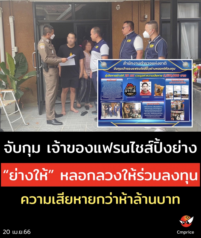 จับกุม เจ้าของแฟรนไชส์ปิ้งย่าง “ย่างให้” หลอกลวงให้ร่วมลงทุนความเสียหายกว่าห้าล้านบาท