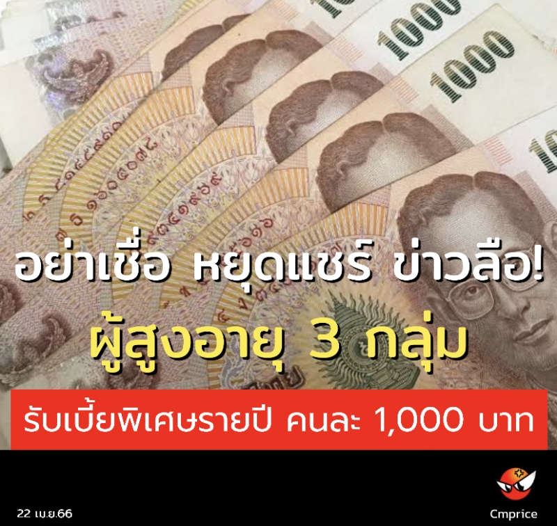 อย่าเชื่อ หยุดแชร์ ข่าวลือ! ผู้สูงอายุ 3 กลุ่ม รับเบี้ยพิเศษรายปี คนละ 1,000 บาท
