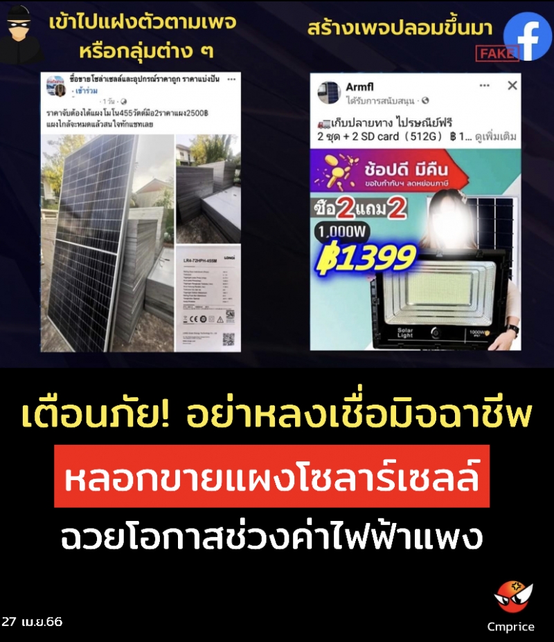 มิจฉาชีพได้ฉวยโอกาสในช่วงที่โซลาร์เซลล์กำลังเป็นที่นิยม ใช้บัญชีเฟซบุ๊กปลอมแฝงตัวเข้ามาในกลุ่มต่างๆ ที่มีการซื้อขายโซลาร์เซลล์ และอุปกรณ์ที่เกี่ยวข้อง โพสต์ประกาศขายสินค้าดังกล่าวในราคาถูกกว่าราคาท้องตลาด ใช้รูปภาพที่คัดลอกมาจากช่องทางที่มีการซื้อจริง โฆษณาอวดอ้างสรรพคุณต่างๆ และมีการเร่งรัดให้รีบตัดสินใจว่าสินค้าใกล้จะหมด และนอกจากนี้แล้วมิจฉาชีพยังใช้วิธีการสร้างเพจเฟซบุ๊กปลอมขึ้นมาทั้งหมดเพื่อหลอกลวงขายสินค้าประเภทดังกล่าวอีกด้วย