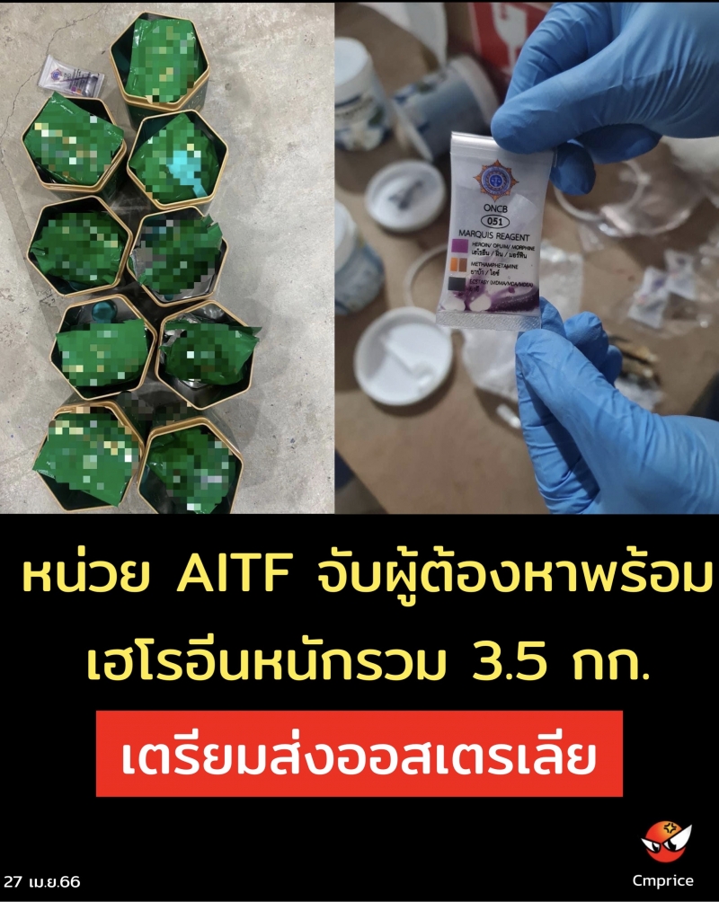 | • ป.ป.ส. เผย หน่วย AITF จับผู้ต้องหาพร้อมเฮโรอีนหนักรวม 3.5 กิโลกรัม เตรียมส่งออสเตรเลีย |