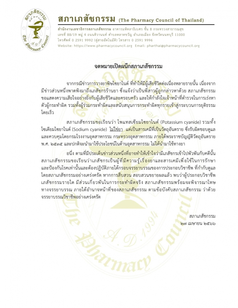 | • สภาเภสัชกรรม ออก จม.เปิดผนึก จ่อฟันโทษ หากพบเภสัชฯ เอี่ยวคดีวางยาไซยาไนด์ |