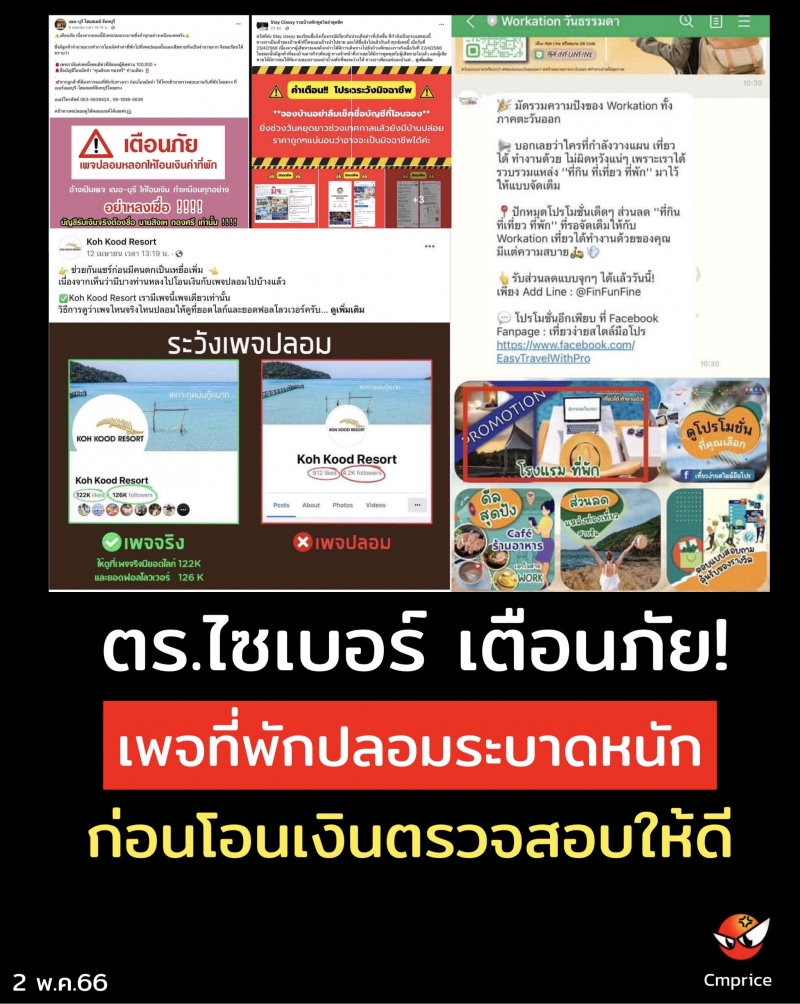 พ.ต.อ.กฤษณะ พัฒนเจริญ โฆษก บช.สอท. ขอประชาสัมพันธ์เตือนภัย มิจฉาชีพสร้างเพจเฟซบุ๊กปลอม โดยลอกเลียนแบบเพจที่พักจริงในพื้นที่สำคัญต่างๆ แอบอ้างเป็นเจ้าของที่พัก หรือแอดมินเพจหลอกลวงประชาชนให้โอนเงินค่ามัดจำ ดังนี้