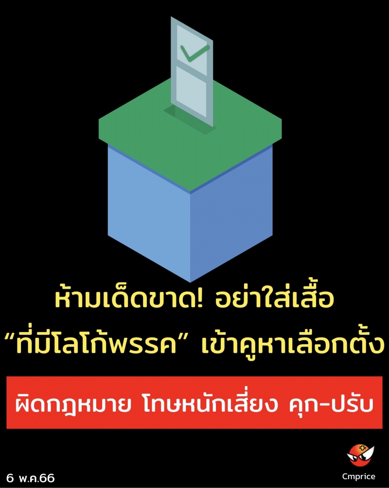 | • ห้ามเด็ดขาด! อย่าใส่เสื้อที่มีโลโก้พรรคเข้าคูหาเลือกตั้ง ผิดกฎหมาย โทษหนักเสี่ยง คุก-ปรับ |