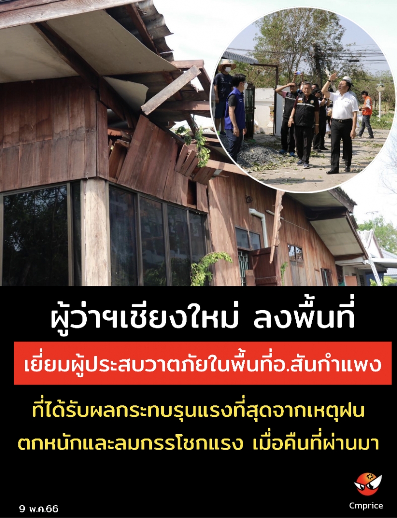 ผู้ว่าราชการจังหวัดเชียงใหม่ ลงพื้นที่เยี่ยมประชาชนที่ประสบวาตภัยในพื้นที่อำเภอสันกำแพง ซึ่งเป็นพื้นที่ที่ได้รับผลกระทบรุนแรงที่สุดจากเหตุฝนตกหนักและลมกรรโชกแรง เมื่อคืนที่ผ่านมา