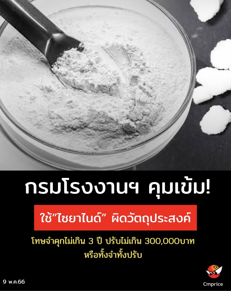 กรมโรงงานฯ สั่งควบคุมใช้ไซยาไนด์ผิดวัตถุประสงค์ หากฝ่าฝืนโทษจำคุกไม่เกิน 3 ปี ปรับไม่เกิน 300,000 บาท หรือทั้งจำทั้งปรับ