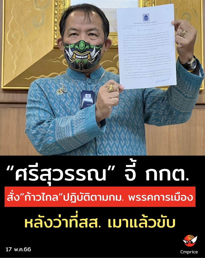 วันนี้ (17 พ.ค.66) นายศรีสุวรรณ จรรยา เลขาธิการสมาคมองค์การพิทักษ์รัฐธรรมนูญไทย ได้ส่งหนังสือถึงเลขาธิการคณะกรรมการการเลือกตั้ง (กกต.) ในฐานะนายทะเบียนพรรคการเมือง เพื่อขอให้แจ้งหรือสั่งให้คณะกรรมการบริหารพรรคก้าวไกลปฏิบัติให้เป็นไปตามกฎหมายพรรคการเมือง