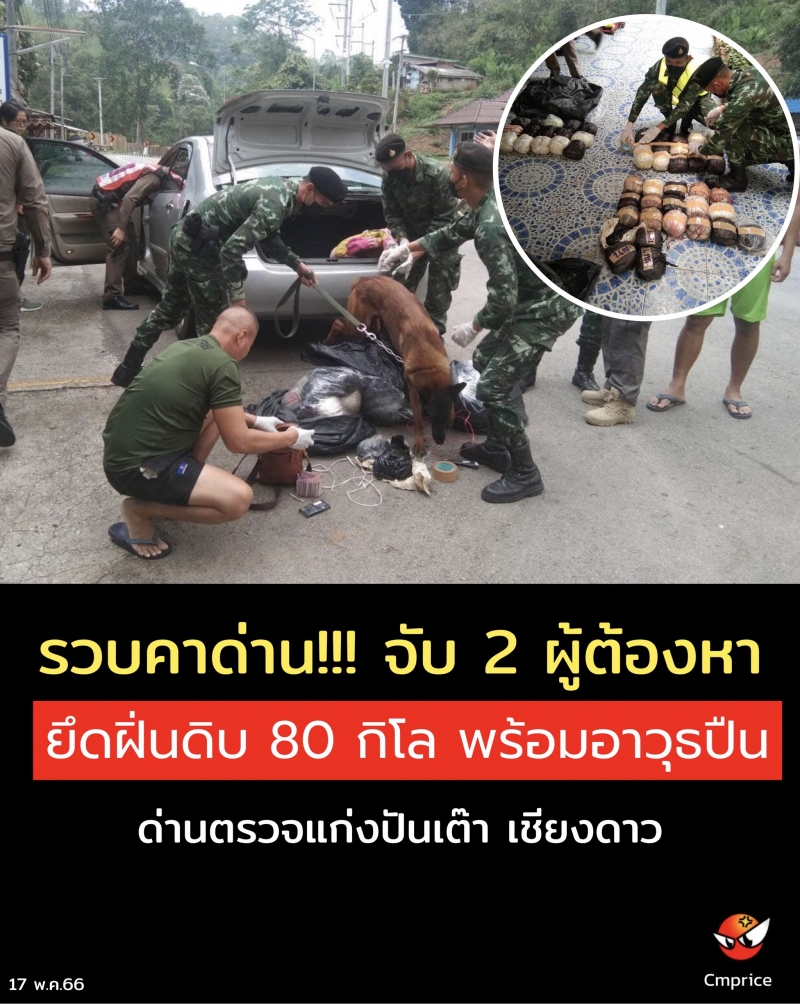 รวบคาด่าน!!! จับ 2 ผู้ต้องหา ยึดฝิ่นดิบ 80 กิโลกรัม พร้อมอาวุธปืน บริเวณด่านตรวจแก่งปันเต๊า