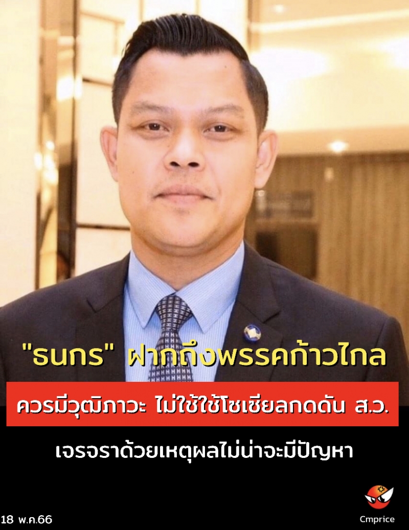 | • "ธนกร" ฝากถึงพรรคก้าวไกล ควรมีวุฒิภาวะ ไม่ควรกดดัน ส.ว. เจรจราด้วยเหตุผลไม่น่าจะมีปัญหา |