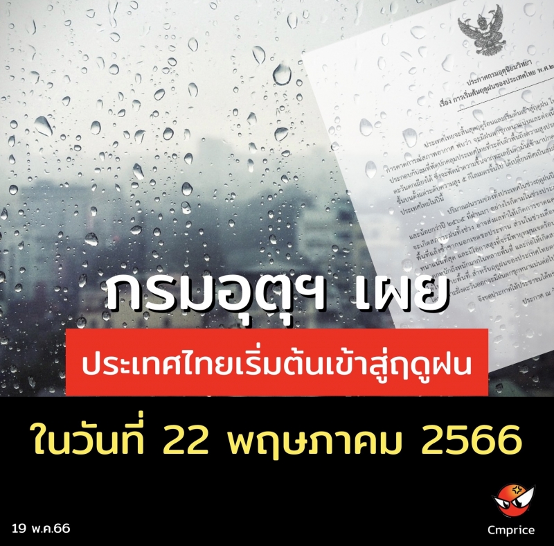 19 พ.ค. 66 กรมอุตุนิยมวิทยาเผยแพร่ประกาศ การเริ่มต้นฤดูฝนของประเทศไทย พ.ศ. 2566