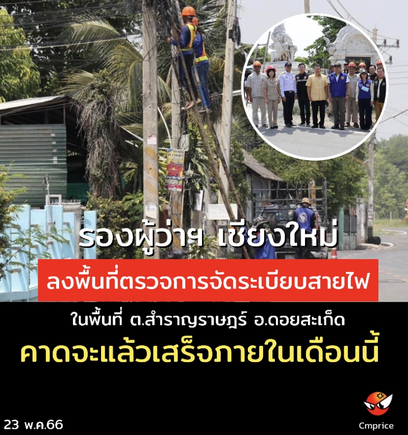 (22 พ.ค. 66) นายนิรัตน์ พงษ์สิทธิถาวร ผู้ว่าราชการจังหวัดเชียงใหม่ มอบหมายให้ นายชัชวาลย์ ปัญญา รองผู้ว่าราชการจังหวัดเชียงใหม่ ลงพื้นที่ตรวจการจัดระเบียบสายไฟฟ้าและสายสื่อสาร ในพื้นที่หมู่ 6 ตำบลสำราญราษฎร์อำเภอดอยสะเก็ด จังหวัดเชียงใหม่ โดยมีการไฟฟ้าส่วนภูมิภาคสำนักงานดอยสะเก็ด สำนักงาน กสทช. โอเปอเรเตอร์ทุกหน่วยสื่อสาร และหน่วยงานที่เกี่ยวข้อง ร่วมลงพื้นที่ดำเนินการคัดแยก และรื้อสายที่ใช้งานไม่ได้ออก และจัดระเบียบสายทั้งหมด รวมเป็นระยะทางประมาณ 1 กิโลเมตร โดยจะบรรจบกันที่หมู่ 9 ตำบลสันปูเลย อำเภอดอยสะเก็ด ซึ่งกำลังดำเนินการจัดระเบียบสายไฟฟ้า สายสื่อสารอยู่เช่นเดียวกัน