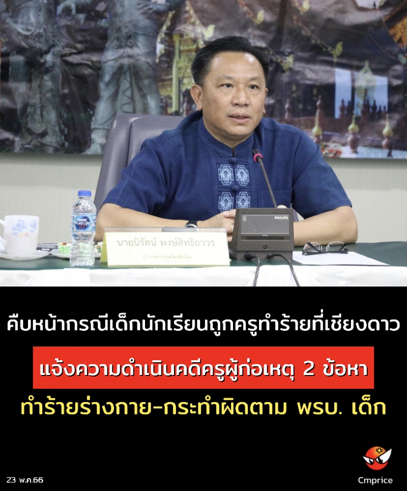 วันนี้ (23 พ.ค. 66) ที่ห้องประชุม 4 ชั้น 4 อาคารอำนวยการ ศาลากลางจังหวัดเชียงใหม่ นายนิรัตน์ พงษ์สิทธิถาวร ผู้ว่าราชการจังหวัดเชียงใหม่ พร้อมด้วย พ.ต.อ.เสกสรรค์ ขันคำนันต๊ะ ผู้กำกับสถานีตำรวจภูธรเชียงดาว นางสาวกิรณาโนนสินชัย รองศึกษาธิการจังหวัดเชียงใหม่ นางจิราพร เชาวน์ประยูร ยามาโมโต้ พัฒนาสังคมและความมั่นคงของมนุษย์จังหวัดเชียงใหม่และหน่วยงานที่เกี่ยวข้อง ร่วมแถลงถึงความคืบหน้ากรณีมีการเผยแพร่ภาพข่าวเด็กนักเรียนโรงเรียนแห่งหนึ่งในอำเภอเชียงดาวถูกครูทำร่างกาย