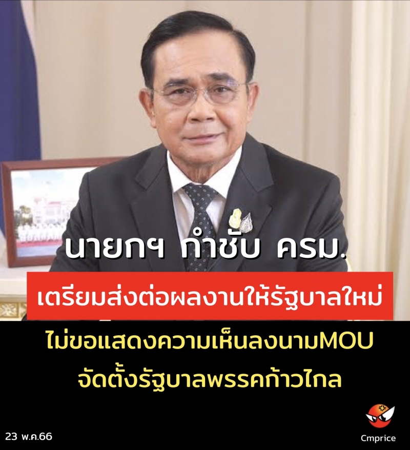 | • นายกฯ กำชับคณะรัฐมนตรีส่งต่อผลงานให้รัฐบาลใหม่ และไม่ขอแสดงความเห็นการลงนามบันทึกความเข้าใจการจัดตั้งรัฐบาลของพรรคก้าวไกล |