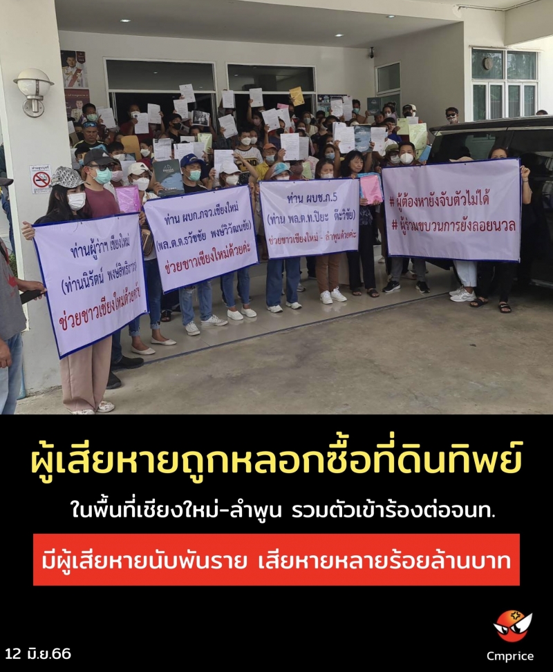 วันนี้ 12 มิ.ย.66 ผู้เสียหายจากการผ่อนซื้อที่ดินทิพย์จำนวนมาก ได้เข้าร้องเรียน พล.ต.ท.ปิยะ ต๊ะวิชัย ผู้บัญชาการตำรวจภูธรภาค5 หลังถูกหลอกให้ผ่อนที่ดินในโครงการที่ดินจัดสรรโดยบริษัทเอกชน มากกว่า 10 โครงการ ในพื้นที่จังหวัดเชียงใหม่-ลำพูน (อ.สารภี ,แม่ริม ,สันกำแพง) มีนายหน้าทำคลิปขายลงสื่อออนไลน์ มีการโฆษณาว่าได้ปรับพื้นที่มีระบบไฟฟ้าน้ำแล้ว สร้างความน่าเชื่อถือ โดยมี นส.พิชามนชุ์ กับสามี จัดสรรที่ดินในราคาถูก มีทั้งแบบเงินสด-เงินผ่อน จนมีผู้หลงเชื่อเป็นพันราย ด้วย ระบบเงินผ่อนตรงที่ไร้ดอกนานถึง4ปี และเมื่อผ่อนได้สามเดือนก็สามารถเข้าไปก่อสร้างได้ หลังจากนั้น ผู้เสียหาย ได้เข้าไปดูที่ดินที่สถานที่จริง และสอบถามจากเจ้าของที่ดินพบว่ายังไม่มีการซื้อขายที่ดินหรือโอนกรรมสิทธิ์ ใดๆ เพื่อทำโครงการดังกล่าว จึงขอคืนเงินจากบริษัทและยกเลิกสัญญาแต่เจ้าของโครงการกลับบ่ายเบี่ยงและติดต่อไม่ได้