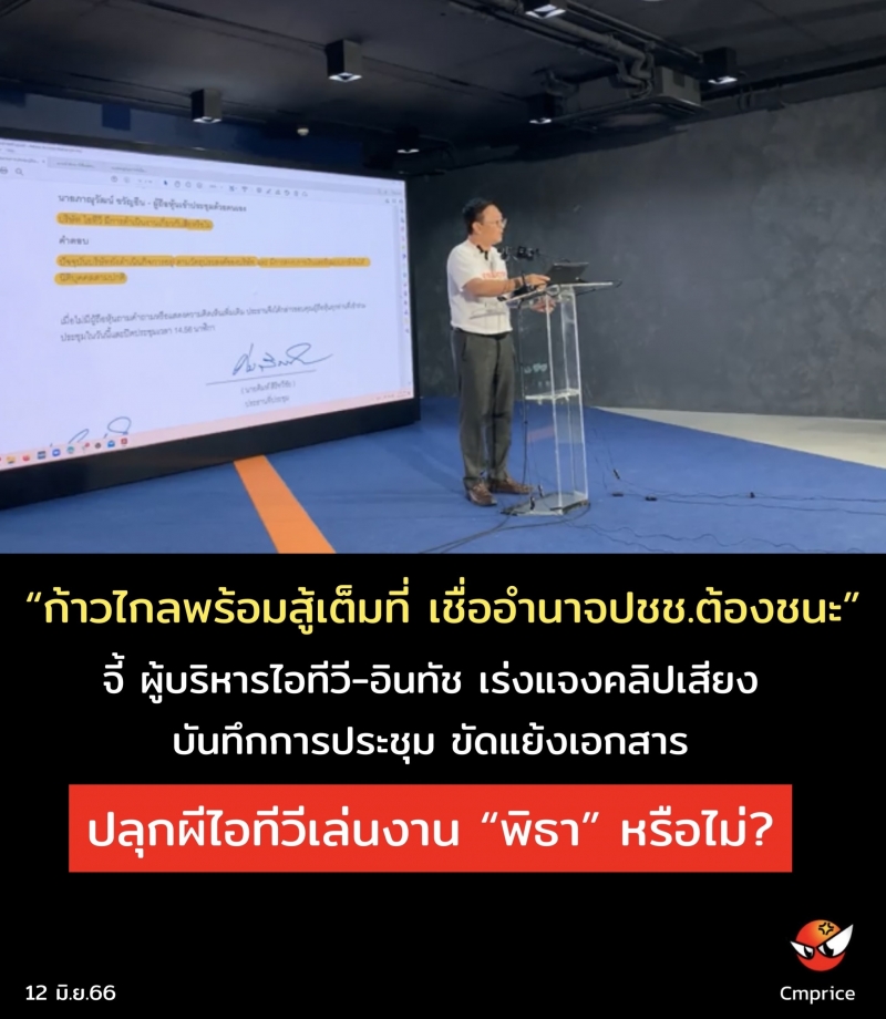 ชัยธวัชกล่าวต่อไป ว่าจึงเป็นที่ชัดเจนว่าข้อความที่ระบุในเอกสารงบทั้งสองชิ้นข้างต้น ขัดแย้งกับสิ่งที่นายคิมห์ตอบคำถามผู้ถือหุ้นในที่ประชุม หากไอทีวีมีแผนธุรกิจดังกล่าวจริง ย่อมต้องแจ้งผู้ถือหุ้นตั้งแต่วันที่ 26 เม.ย. 66 แล้ว ถึงแผนในการดำเนินธุรกิจใหม่ แต่หลังการประชุมผู้ถือหุ้นเพียงสองวัน คณะกรรมการบริษัทกลับมีมติรับทราบแผนธุรกิจใหม่ ซึ่งผิดวิสัยอย่างยิ่ง