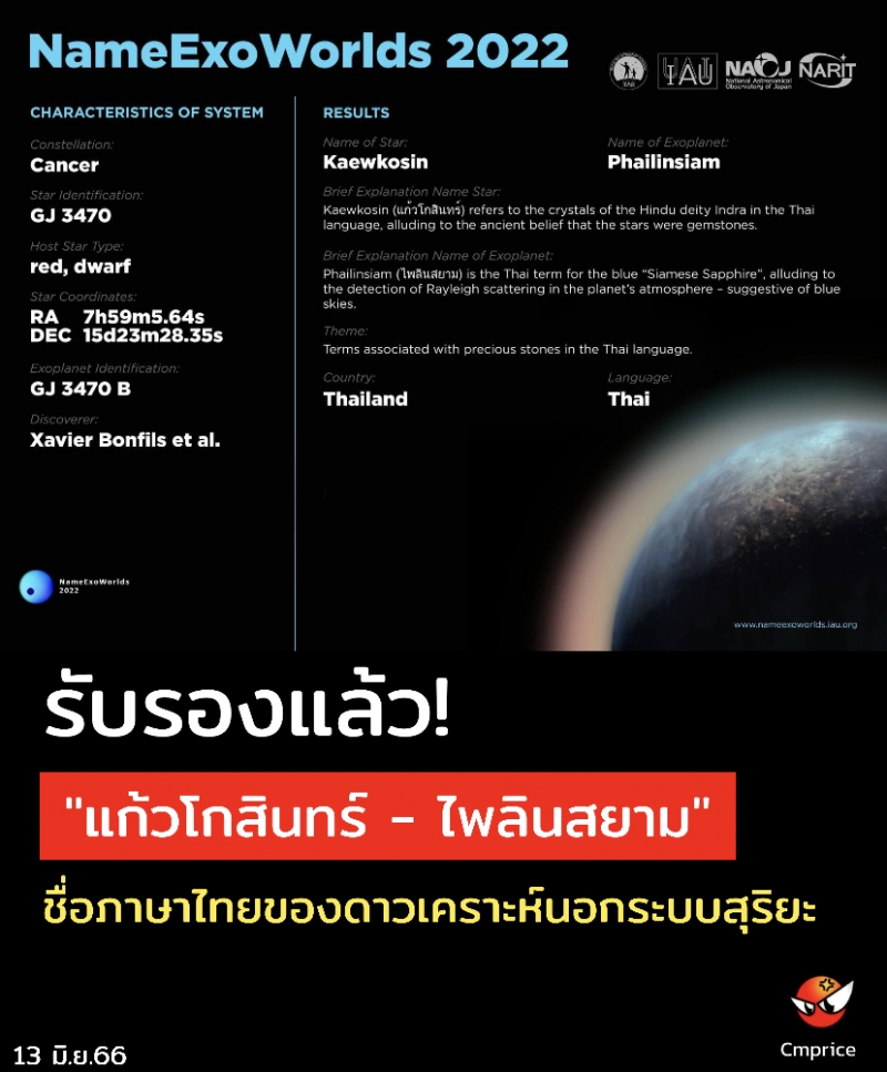 กระทรวงการอุดมศึกษา วิทยาศาสตร์ วิจัยและนวัตกรรม (อว.) โดยสถาบันวิจัยดาราศาสตร์แห่งชาติ (องค์การมหาชน) เผยข่าวดี! สหพันธ์ดาราศาสตร์นานาชาติ หรือ IAU (The International Astronomical Union) ประกาศรับรองชื่อภาษาไทยของดาวฤกษ์แม่ GJ3470 และดาวเคราะห์นอกระบบสุริยะ GJ3470b ในชื่อภาษาไทยว่า “แก้วโกสินทร์” และ “ไพลินสยาม”