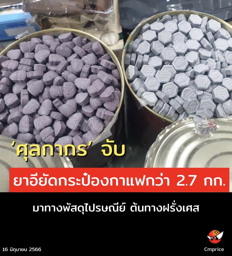 นายพันธ์ทอง ลอยกุลนันท์ ที่ปรึกษาด้านการพัฒนาและบริหารการจัดเก็บภาษี ในฐานะโฆษกกรมศุลกากร เปิดเผยว่ากรมศุลกากรมีการเฝ้าระวังการลักลอบนำยาเสพติดเข้ามาในราชอาณาจักร ทั้งทางบก ทางเรือและทางอากาศ โดยเฉพาะทางพัสดุไปรษณีย์ที่มักมีการลักลอบนำยาเสพติดเข้ามาอย่างต่อเนื่อง ซึ่งในวันนี้ (16 มิถุนายน 2566) เวลา09.00 น. เจ้าหน้าที่ศุลกากร พบพัสดุไปรษณีย์ระหว่างประเทศ ประเภทพัสดุไปรษณีย์ทางอากาศ ต้นทางจากประเทศฝรั่งเศส จำนวน 1 หีบห่อ มีลักษณะที่น่าสงสัย เปิดตรวจพัสดุดังกล่าวร่วมกับพนักงาน บริษัท ไปรษณีย์ไทย จำกัดภายในพบกระป๋องผลิตภัณฑ์กาแฟ จำนวน 4 กระป๋อง ปะปนมากับขนมชนิดต่างๆ จากการตรวจสอบทางกายภาพพบความผิดปกติที่ขอบฝากระป๋องผลิตภัณฑ์กาแฟ จึงนำไปตรวจด้วยเครื่องเอกซเรย์ และพบว่าภาพของผลเอกซเรย์ดังกล่าวมีความผิดปกติ เจ้าหน้าที่จึงร่วมกันเปิดฝากระป๋องผลิตภัณฑ์กาแฟ ทั้ง 4 กระป๋อง ภายในตรวจพบเม็ดยาสีเทาและสีม่วง เจ้าหน้าที่จึงนำตัวอย่างดังกล่าวไปทดสอบด้วยน้ำยามาร์ควิส พบว่าทำปฏิกิริยากับน้ำยาทดสอบเปลี่ยนจากใสเป็นสีเทาและสีดำในเวลาต่อมา และทดสอบด้วยเครื่อง PROGENY RESQ แสดงผลเป็น MDMA จึงสันนิษฐานได้ว่าเม็ดยาดังกล่าว เป็นยาเสพติดให้โทษประเภท 1 ยาอี (ECSTASY) น้ำหนักรวมสิ่งห่อหุ้มประมาณ 2,723 กรัมมูลค่ากว่า 3.5 ล้านบาท