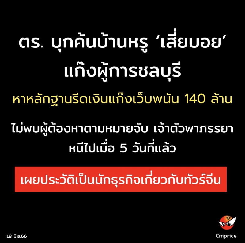 | • ตร. บุกค้นบ้านหรู เสี่ยบอย แก๊งผู้การชลบุรี หาหลักฐานรีดเงินแก๊งเว็บพนัน 140 ล้าน ไม่พบผู้ต้องหาตามหมายจับ |