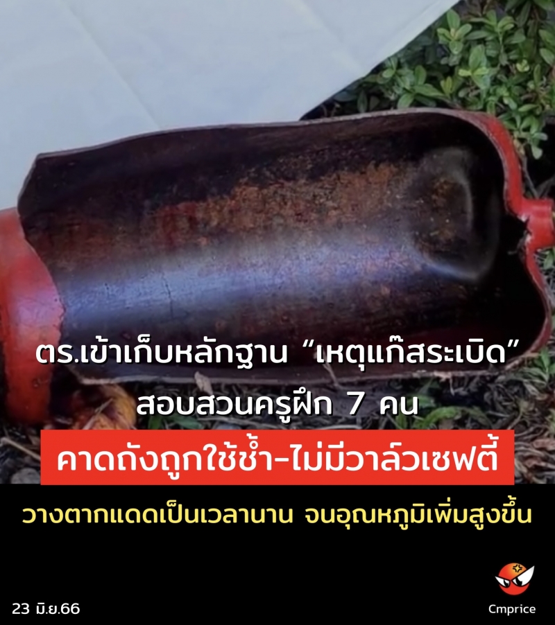 | • ตร.เข้าเก็บหลักฐาน เหตุแก๊สระเบิด สอบสวนครูฝึก 7 คน คาดถังถูกใช้ช้ำ-ไม่มีวาล์วเซฟตี้ และวางตากแดดเป็นเวลานาน จนอุณหภูมิเพิ่มสูงขึ้น |