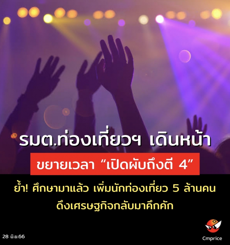 | • รมต. ท่องเที่ยวเดินหน้าขยายเวลา เปิดผับถึงตี 4 ย้ำศึกษามาแล้ว เป็นทางบวกเพิ่มนักท่องเที่ยว 5 ล้านคน รวมถึงดึงเศรษฐกิจกลับมาคึกคัก |
