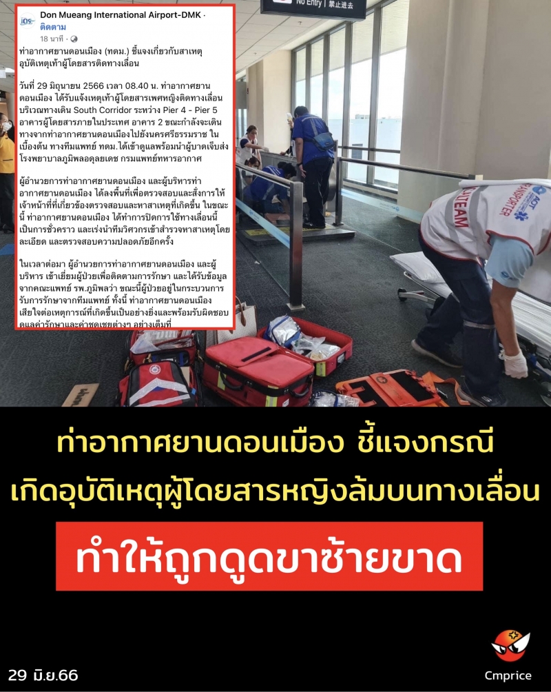 | • ท่าอากาศยานดอนเมือง ชี้แจงกรณี เกิดอุบัติเหตุผู้โดยสารหญิงล้ม บนทางเลื่อนทำให้ถูกดูดขาซ้ายขาด |