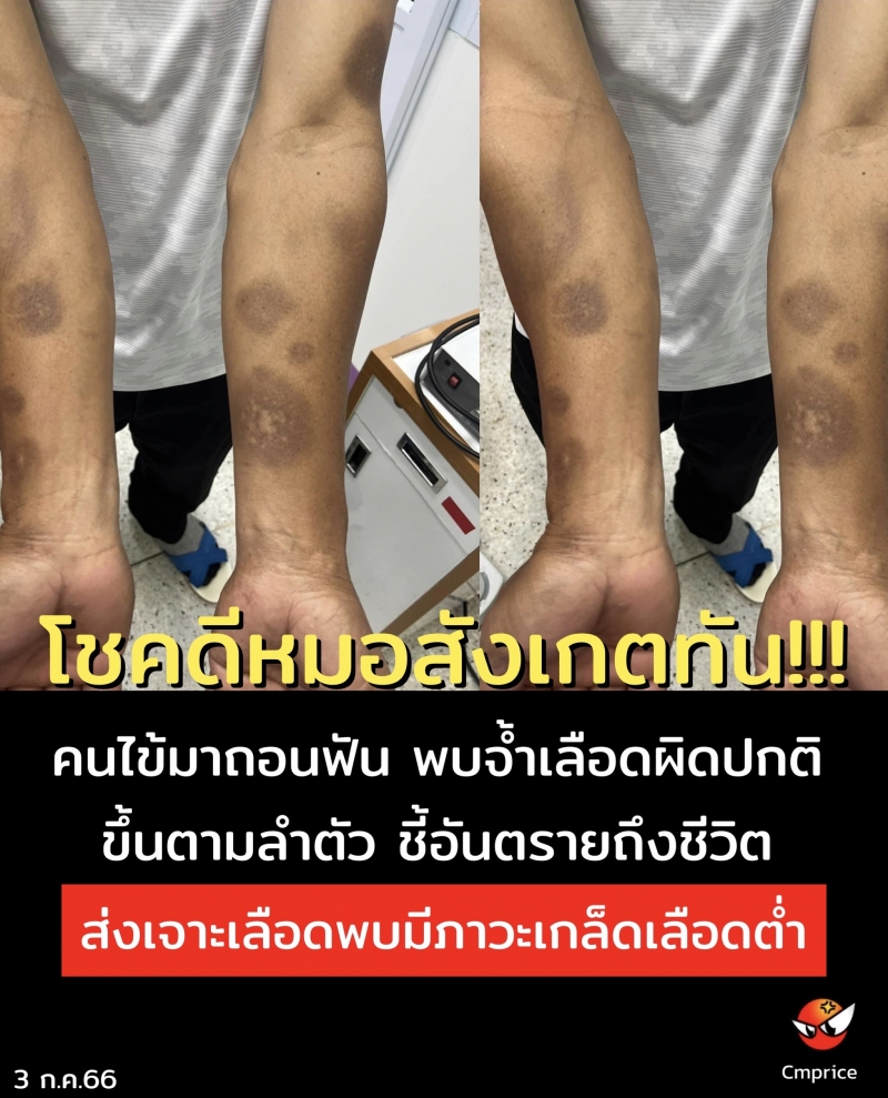 | • หมอสังเกตทัน!!! คนไข้มาถอนฟัน พบจ้ำเลือดผิดปกติขึ้นตามลำตัว ชี้อันตรายถึงชีวิต ส่งเจาะเลือดพบมีภาวะเกล็ดเลือดต่ำ |