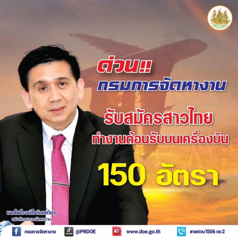 กรมการจัดหางาน กระทรวงแรงงาน เปิดรับสมัครพนักงานต้อนรับบนเครื่องบินเพื่อไปทำงานในประเทศสิงคโปร์จำนวน 150 อัตรา เงินเดือน 36,956 บาท (ไม่รวมค่าล่วงเวลา) ฟรีค่าโดยสารเครื่องบินไป - กลับ อาหาร ที่พัก และสวัสดิการอื่นๆ ตามกฎหมายสิงคโปร์ รับสมัครตั้งแต่บัดนี้ถึง 31 กรกฎาคม 2566