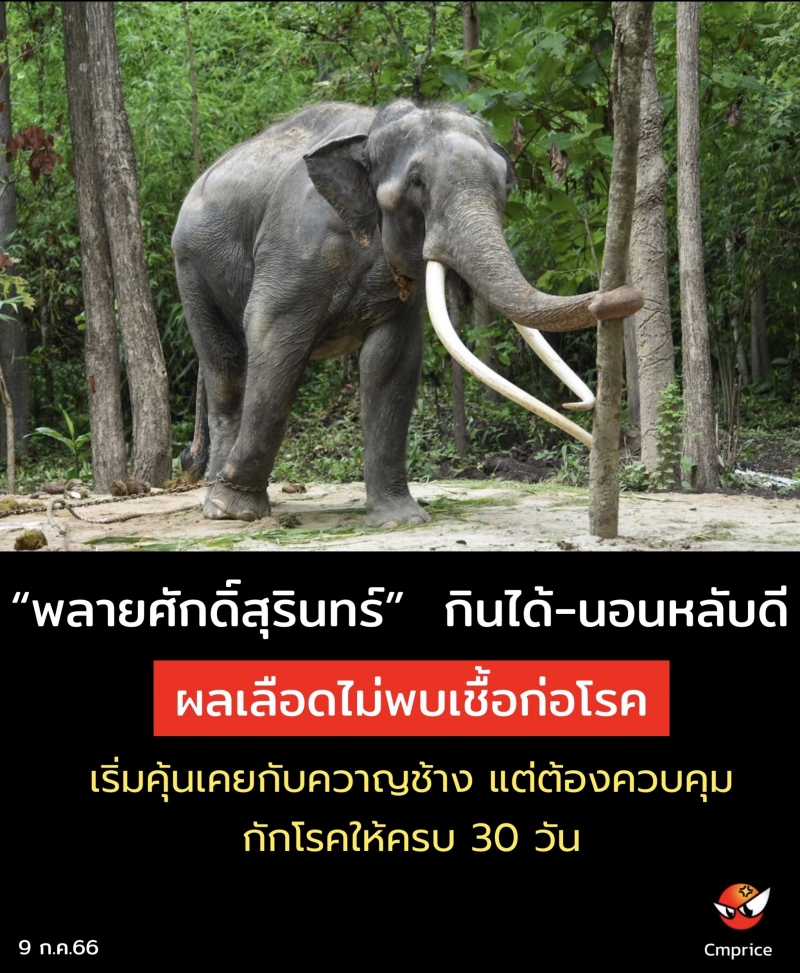 | • พลายศักดิ์สุรินทร์ กินได้-นอนหลับดี-ผลเลือดไม่พบเชื้อก่อโรค เริ่มคุ้นเคยกับควาญช้าง |