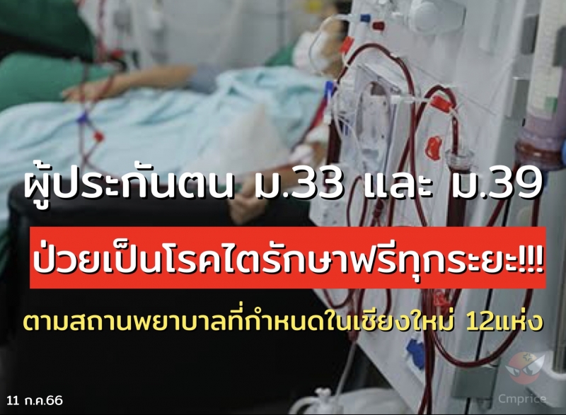 วันนี้ (11 ก.ค. 66) นายวิรัตน์ ส่วยนุ นักวิชาการแรงงานชำนาญการ รักษาราชการในตำแหน่งนักวิชาการแรงงานชำนาญการพิเศษสำนักงานประกันสังคมจังหวัดเชียงใหม่ เปิดเผยในการแถลงข่าวสื่อมวลชนประจำสัปดาห์จังหวัดเชียงใหม่ เกี่ยวกับผู้ประกันตนมาตรา 33 และ 39 ที่ป่วยด้วยโรคไตทุกระยะ สามารถเข้ารับการรักษาในโรงพยาบาลที่กำหนดได้ฟรี