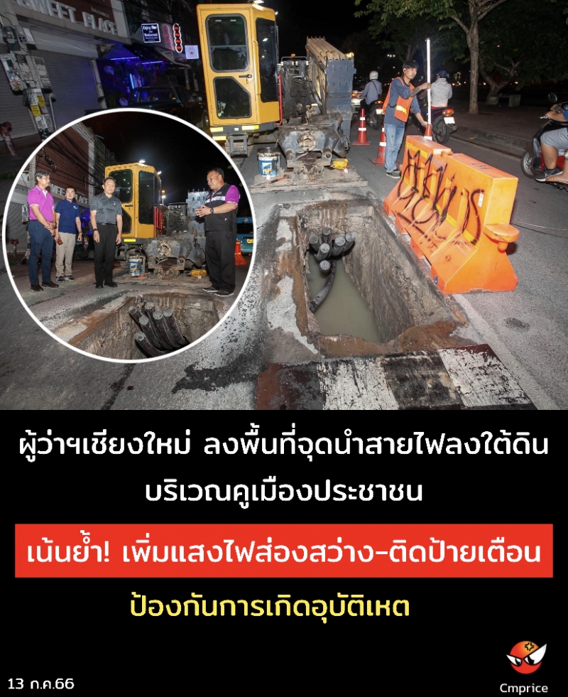 ผู้ว่าราชการจังหวัดเชียงใหม่ ลงพื้นที่ตรวจเยี่ยมให้กำลังใจเจ้าหน้าที่ผู้ปฏิบัติงานนำสายไฟลงใต้ดิน บริเวณคูเมืองเชียงใหม่ พร้อมเน้นย้ำให้เพิ่มแสงไฟส่องสว่าง และติดป้ายเตือนประชาชน ป้องกันการเกิดอุบัติเหตุ