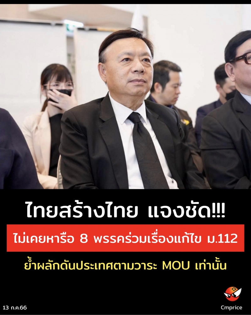 | • ไทยสร้างไทย แจงชัดไม่เคยหารือ 8 พรรคร่วมเรื่องแก้ไข ม.112 ย้ำผลักดันประเทศตามวาระ MOU เท่านั้น |
