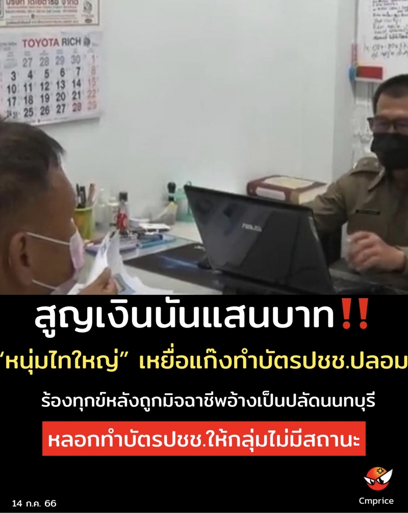 โผล่รายวันเหยื่อแก๊งทำบัตรประชาชนปลอม เข้าร้องทุกข์กับหัวหน้าศูนย์บริหารการทะเบียนภาค 5 สาขาจังหวัดเชียงใหม่ หลังถูกมิจฉาชีพอ้างเป็นปลัดนนทบุรี หลอกทำบัตรประชาชนให้กลุ่มไม่มีสถานะทางทะเบียน ผู้เสียหายสูญเงินนันแสนบาท ลำบากต้องมาใช้หนี้ให้ญาติ พอทวงเงินไปแม่กับเมียที่ป่วย ถูกบล็อกการติดต่อ ขณะเดียวกันพบมิจฉาชีพอีกกลุ่มตั้งเพจรับทำบัตรประชาชนนำรูป มท.1 โชว์หราไม่กลัวความผิด