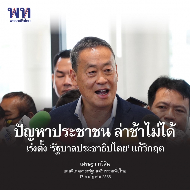 เศรษฐา ทวีสิน แคนดิเดตนายกรัฐมนตรี พรรคเพื่อไทย ชี้สถานการณ์วิกฤตเศรษฐกิจประเทศ ปัญหาปากท้องพี่น้องประชาชน ภาวะหนี้เสีย ตลอดจนปัญหาเอลนีโญและภัยแล้งทั่วประเทศ กำลังสร้างความเดือดร้อนให้พี่น้องประชาชนอย่างหนัก และกำลังรอให้รัฐบาลชุดใหม่ ซึ่งมาจากพรรคฝ่ายประชาธิปไตยมาแก้ไข ดังนั้นจึงขอให้ 8 พรรคร่วมประชาธิปไตย ต้องพูดคุยกันเพื่อผลักดันจัดตั้งรัฐบาลใหม่โดยเร็วที่สุด เพื่อมาแก้ไขปัญหาให้พี่น้องประชาชน