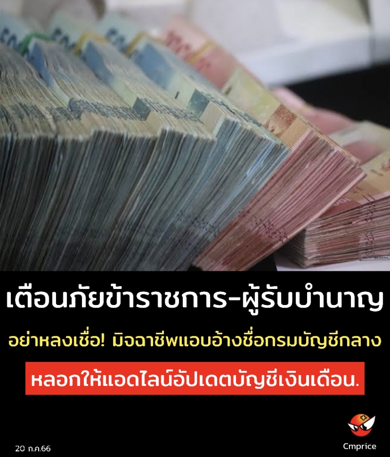 | • เตือนภัยข้าราชการ ผู้รับบำนาญ อย่าหลงเชื่อ! มิจฉาชีพแอบอ้างชื่อกรมบัญชีกลาง หลอกให้แอดไลน์อัปเดตบัญชีเงินเดือน |
