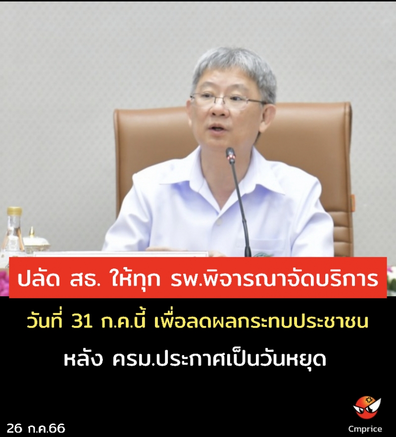 ปลัดกระทรวงสาธารณสุข สั่งการนายแพทย์สาธารณสุขจังหวัดและผู้อำนวยการโรงพยาบาลในสังกัดทุกแห่งพิจารณาจัดบริการวันที่ 31 กรกฎาคมนี้ ตามบริบทและความเหมาะสมของสถานการณ์ หลัง ครม.ประกาศเป็นวันหยุดพิเศษ ยึดหลักให้เกิดผลกระทบกับประชาชนน้อยที่สุด หากมีการจัดบริการตามปกติให้จ่ายค่าตอบแทนบุคลากรนอกเวลาราชการตามระเบียบ