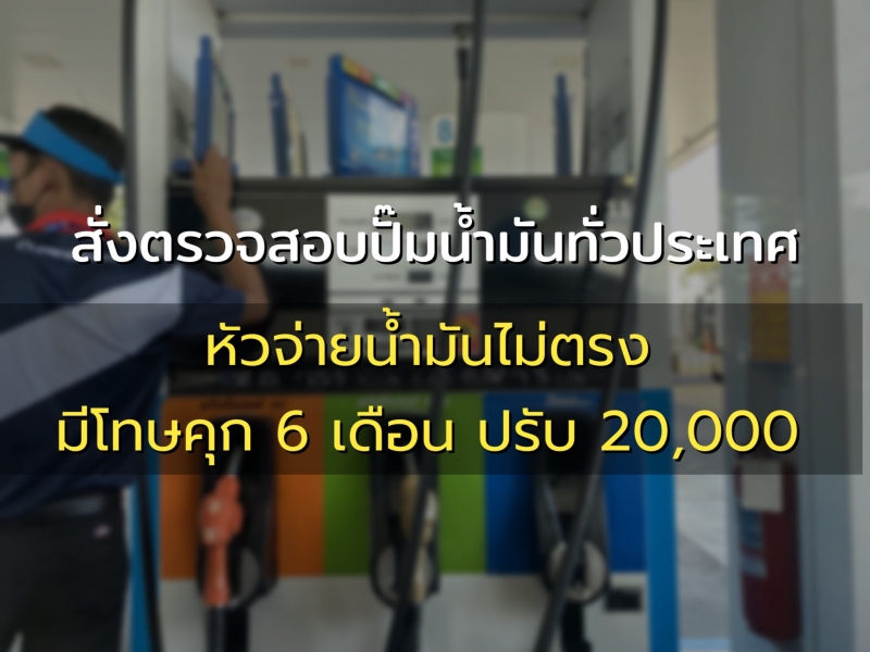 | • กรมการค้าภายใน สั่งตรวจสอบปั๊มน้ำมันทั่วประเทศ หลังประชาชนร้องเรียนได้น้ำมันไม่เต็มตามปริมาตร หัวจ่ายน้ำมันไม่ตรง มีโทษคุก 6 เดือน ปรับ 20,000 |
