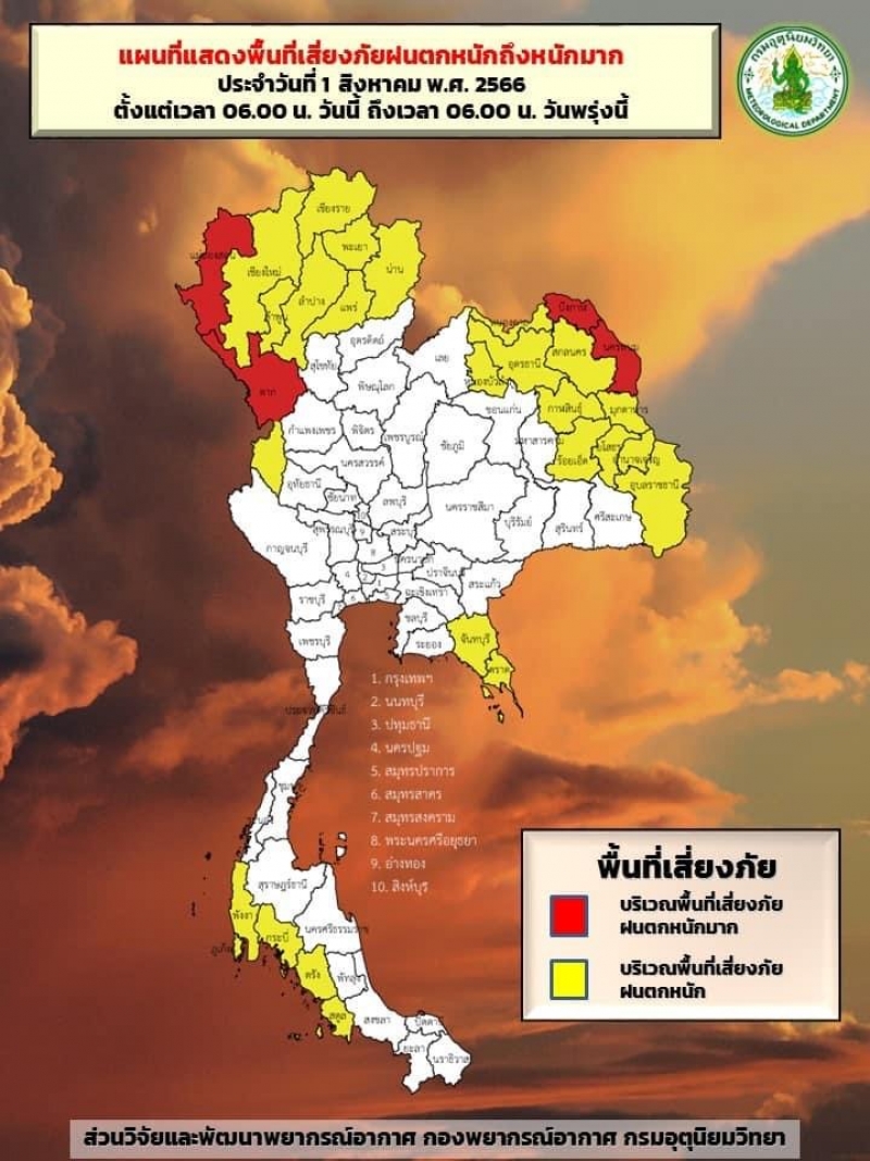 ร่องมรสุมพาดผ่านภาคเหนือตอนบนและประเทศลาวตอนบน เข้าสู่หย่อมความกดอากาศต่ำบริเวณประเทศเวียดนามตอนบน ประกอบกับมรสุมตะวันตกเฉียงใต้กำลังค่อนข้างแรงพัดปกคลุมทะเลอันดามัน ประเทศไทย และอ่าวไทยลักษณะเช่นนี้ทำให้ประเทศไทยยังคงมีฝนตกต่อเนื่องและมีฝนตกหนักถึงหนักมากบางแห่งบริเวณภาคเหนือ ภาคตะวันออกเฉียงเหนือ ภาคกลาง ภาคตะวันออก และภาคใต้ ขอให้ประชาชนในบริเวณดังกล่าวระวังอันตรายจากฝนตกหนักถึงหนักมากและฝนที่ตกสะสมซึ่งอาจทำให้เกิดน้ำท่วมฉับพลันและน้ำป่าไหลหลาก โดยเฉพาะพื้นที่ลาดเชิงเขาใกล้ทางน้ำไหลผ่านและพื้นที่ลุ่ม รวมทั้งเพิ่มความระมัดระวังในการสัญจรผ่านบริเวณที่มีฝนฟ้าคะนองไว้ด้วย