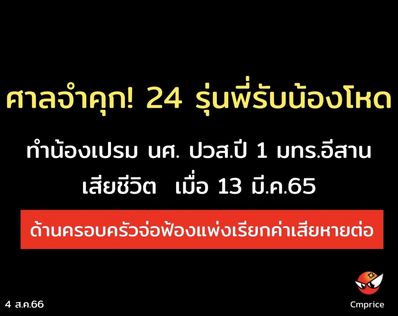 | • ศาลจำคุก! 24 รุ่นพี่รับน้องโหด ทำน้องเปรม นศ. ปวส.ปี 1 มทร.อีสาน เสียชีวิต เมื่อ 13 มี.ค.65 ด้านครอบครัวจ่อฟ้องแพ่งเรียกค่าเสียหายต่อ |
