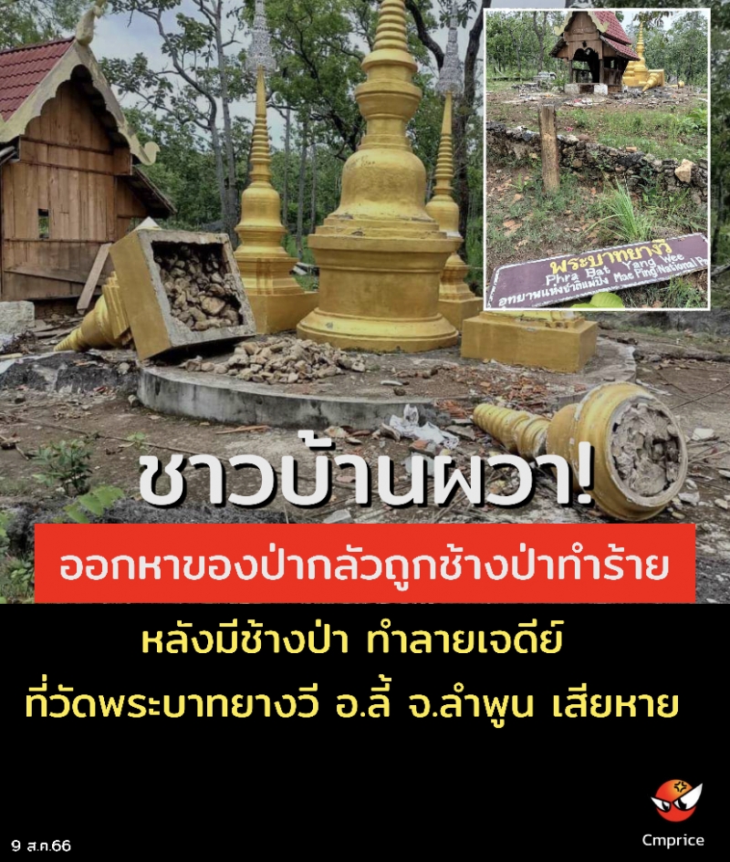 จากกรณีเมื่อวันที่ 7 ส.ค.2566 ที่ผ่านมา ได้มีช้างป่าไม่ทราบจำนวน บุกทำลายเจดีย์ในบริเวณวัดพระบาทยางวี พื้นที่หน่วยอนุรักษ์ป่ายางวี อุทยานแห่งชาติแม่ปิง หมู่1 ต.ก้อ อ.ลี้ จ.ลำพูน ได้รับความเสียหาย ไม่มีใครถูกช้างป่าทำร้ายแต่อย่างใด