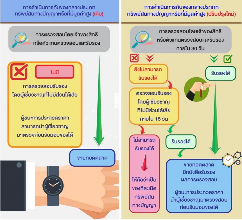 ในส่วนของขั้นตอนการตรวจสอบของกลางจะมีการกำหนดขั้นตอนไว้ชัดเจน จากเดิม กำหนดให้เจ้าหน้าที่ผู้นำส่งของกลางหรือผู้จับกุมจะต้องแจ้งให้เจ้าของสิทธิหรือตัวแทนฯมาทำการตรวจสอบและรับรองว่าเป็นของที่ละเมิดทรัพย์สินทางปัญญาก่อนและเมื่อดำเนินการเสร็จแล้ว ให้นำส่งและรับของกลางต่อไป แก้ไขเพิ่มเติม โดย กำหนดให้เจ้าหน้าที่ผู้นำส่งของกลางตรวจสอบว่าของดังกล่าวเป็นของที่ละเมิดทรัพย์สินทางปัญญาหรือไม่ โดยแจ้งให้เจ้าของสิทธิหรือตัวแทนทำการตรวจสอบและรับรองให้แล้วเสร็จภายใน 30 วันนับแต่วันที่จับกุม และหากเจ้าของสิทธิหรือตัวแทนไม่สามารถรับรองได้ภายในระยะเวลาดังกล่าว ให้ผู้นำส่งของกลางจัดให้มีผู้เชี่ยวชาญซึ่งไม่มีส่วนได้เสียมาตรวจสอบและรับรองภายใน 15 วันนับแต่วันที่ได้รับหนังสือแจ้งผลจากเจ้าของสิทธิหรือตัวแทนหรือเมื่อพ้นกำหนดระยะเวลา 45 วัน ในขั้นตอนการตรวจสอบของเจ้าของสิทธิหรือตัวแทนให้ถือว่าของกลางดังกล่าวเป็นของละเมิด