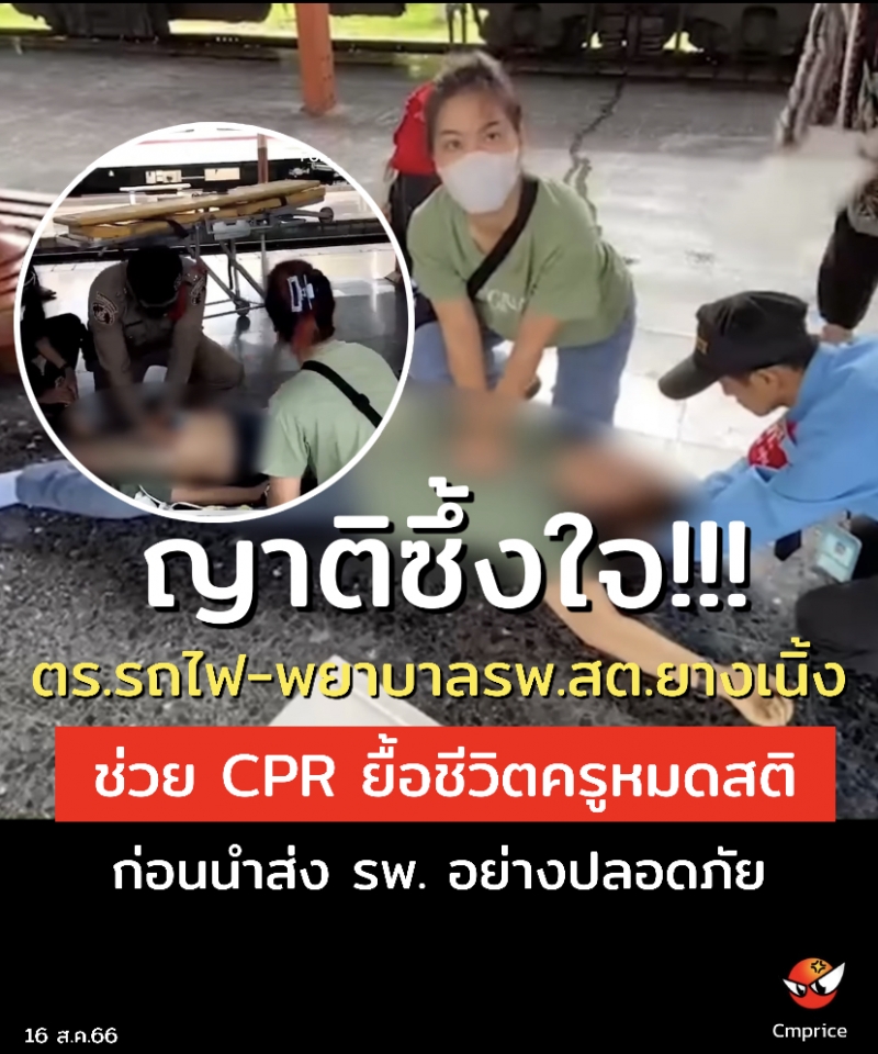| • ญาติซึ้งใจ ตร.รถไฟ-พยาบาลรพ.สต.ยางเนิ้ง ช่วยทำCPRยื้อชีวิตครูหมดสติ กลางสถานีรถไฟเชียงใหม่ ก่อนนำส่ง รพ. อย่างปลอดภัย |